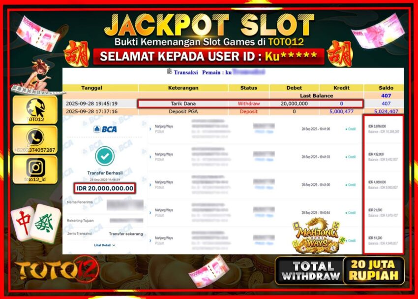 Selamat kepada Member Kami Ku****** Telah Jackpot dan berhasil mendapatkan kemenangan besar pada permainan JACKPOT SLOT GAME (MAHJONG WAYS) Dengan Kemenangan Sebesar Rp.Ku.000.000 –. Setelah mengisi Fomulir Withdraw dengan Kurang waktu 1-2 Menit Dana sudah kami Trasnfer kepada Pemilik Userid dan dana sudah dapat di cairkan oleh pemenang. Bukti Pembayaran yang TOTO12 berikan merupakan Bukti Pembayaran yang SAH / VALID yang langsung Di dapatkan melalui transaksi dari Bank yang di Tunju.