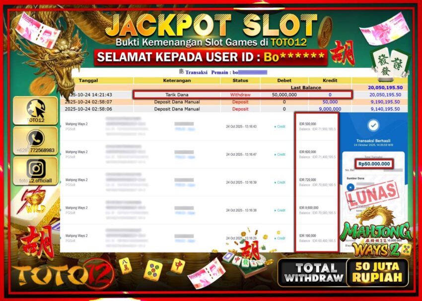 Selamat kepada Member Kami Bo****** Telah Jackpot dan berhasil mendapatkan kemenangan besar pada permainan JACKPOT SLOT GAME (MAHJONG WAYS 2) Dengan Kemenangan Sebesar Rp.50.000.000 –. Setelah mengisi Fomulir Withdraw dengan Kurang waktu 1-2 Menit Dana sudah kami Trasnfer kepada Pemilik Userid dan dana sudah dapat di cairkan oleh pemenang. Bukti Pembayaran yang TOTO12 berikan merupakan Bukti Pembayaran yang SAH / VALID yang langsung Di dapatkan melalui transaksi dari Bank yang di Tunju.