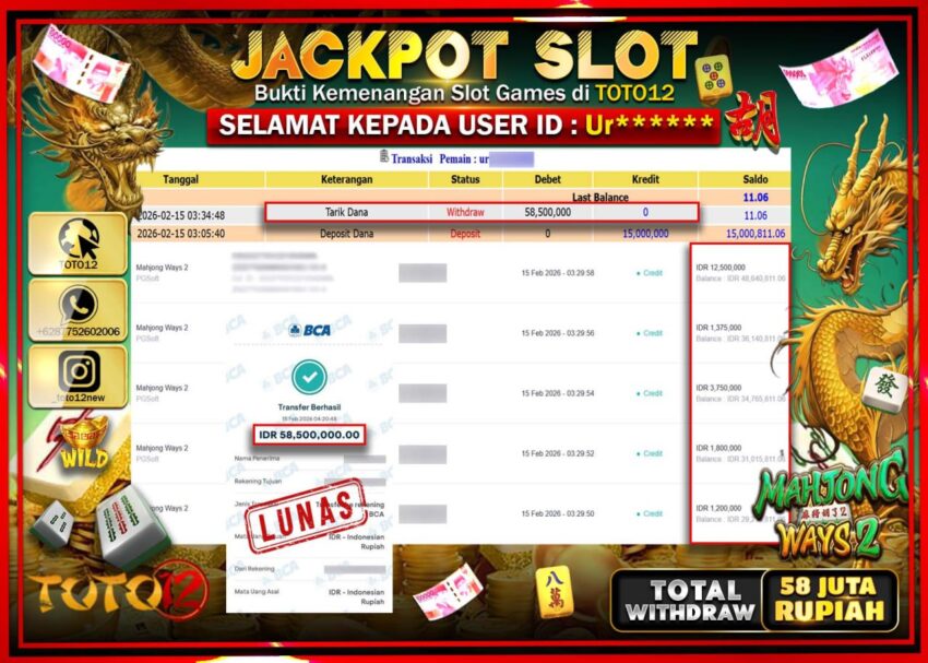 Selamat kepada Member Kami Ur*****  Telah Jackpot dan berhasil mendapatkan kemenangan besar pada permainan JACKPOT SLOT GAME  (MAHJONG WAYS 2)  Dengan Kemenangan Sebesar Rp.58.500.000–.