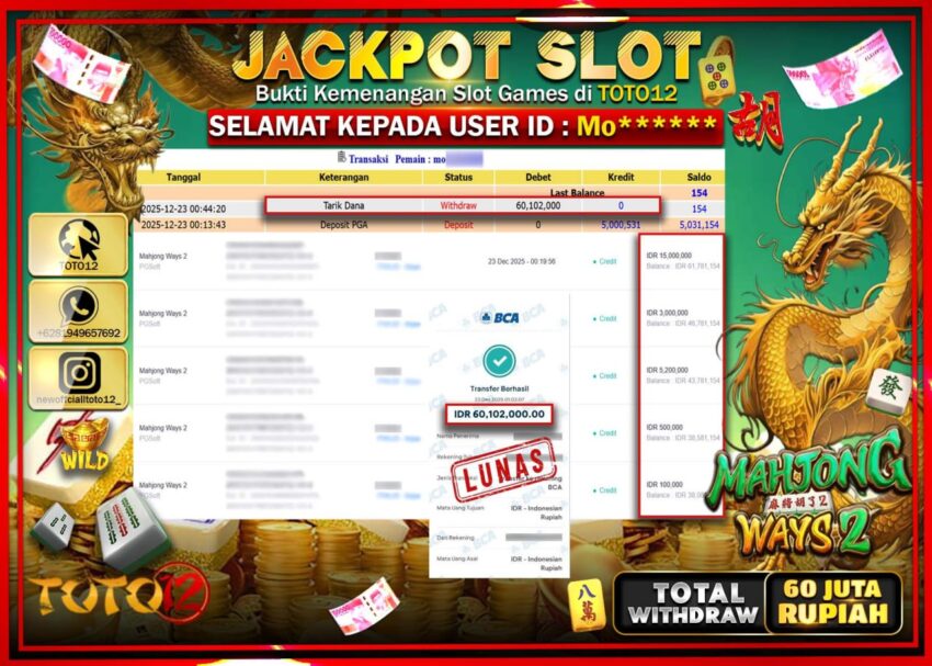 Selamat kepada Member Kami Mo****** Telah Jackpot dan berhasil mendapatkan kemenangan besar pada permainan JACKPOT SLOT GAME (MAHJONG WAYS 2)  Dengan Kemenangan Sebesar Rp.60.102.000 –.