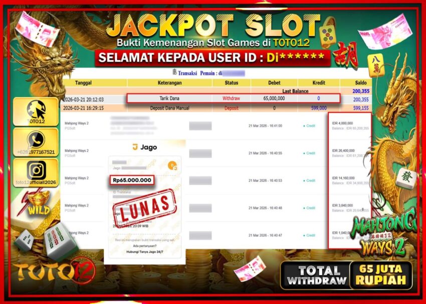 HANYA DI TOTO12 JP PASTI DI BAYAR LUNAS DAN CEPAT!!!!!! JACKPOT SLOT GAME (MAHJONG WAYS 2) Rp.65.000.000!!!!