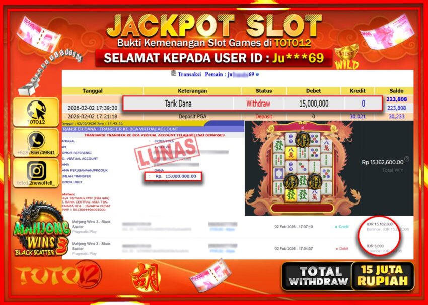 Selamat kepada Member Kami Ju****** Telah Jackpot dan berhasil mendapatkan kemenangan besar pada permainan JACKPOT SLOT GAME (MAHJONG WAYS 3 BLACK SCATTER Dengan Kemenangan Sebesar Rp.15.000.000 –.
