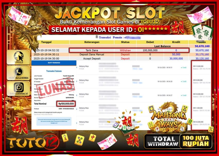 Selamat kepada Member Kami Ol****** Telah Jackpot dan berhasil mendapatkan kemenangan besar pada permainan JACKPOT SLOT GAME (MAHJONG WAYS)  Dengan Kemenangan Sebesar Rp.100.000.000 –.  Setelah mengisi Fomulir Withdraw dengan Kurang waktu 1-2 Menit Dana sudah kami Trasnfer kepada Pemilik Userid dan dana sudah dapat di cairkan oleh pemenang. Bukti Pembayaran yang TOTO12 berikan merupakan Bukti Pembayaran yang  SAH / VALID yang langsung Di dapatkan melalui transaksi dari Bank yang di Tunju.