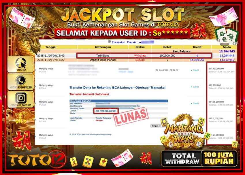 Selamat kepada Member Kami Se****** Telah Jackpot dan berhasil mendapatkan kemenangan besar pada permainan JACKPOT SLOT GAME (MAHJONG WAYS)  Dengan Kemenangan Sebesar Rp.100.000.000 –.  Setelah mengisi Fomulir Withdraw dengan Kurang waktu 1-2 Menit Dana sudah kami Trasnfer kepada Pemilik Userid dan dana sudah dapat di cairkan oleh pemenang. Bukti Pembayaran yang TOTO12 berikan merupakan Bukti Pembayaran yang  SAH / VALID yang langsung Di dapatkan melalui transaksi dari Bank yang di Tunju.