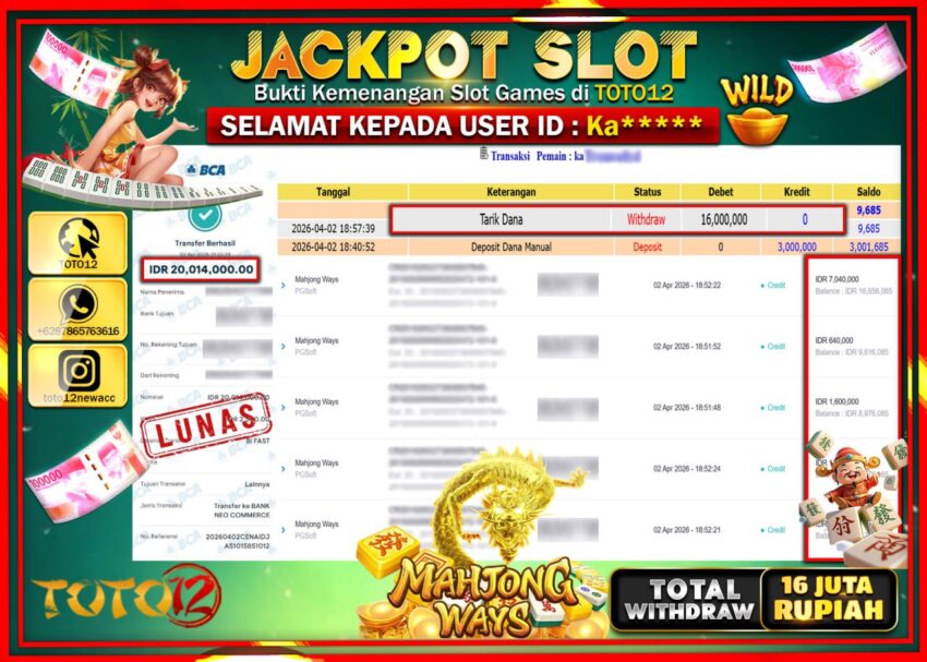 Selamat kepada Member Kami Ka***** Telah Jackpot dan berhasil mendapatkan kemenangan besar pada permainan JACKPOT SLOT GAME (MAHJONG WAYS) Dengan Kemenangan Sebesar Rp.16.000.000–.