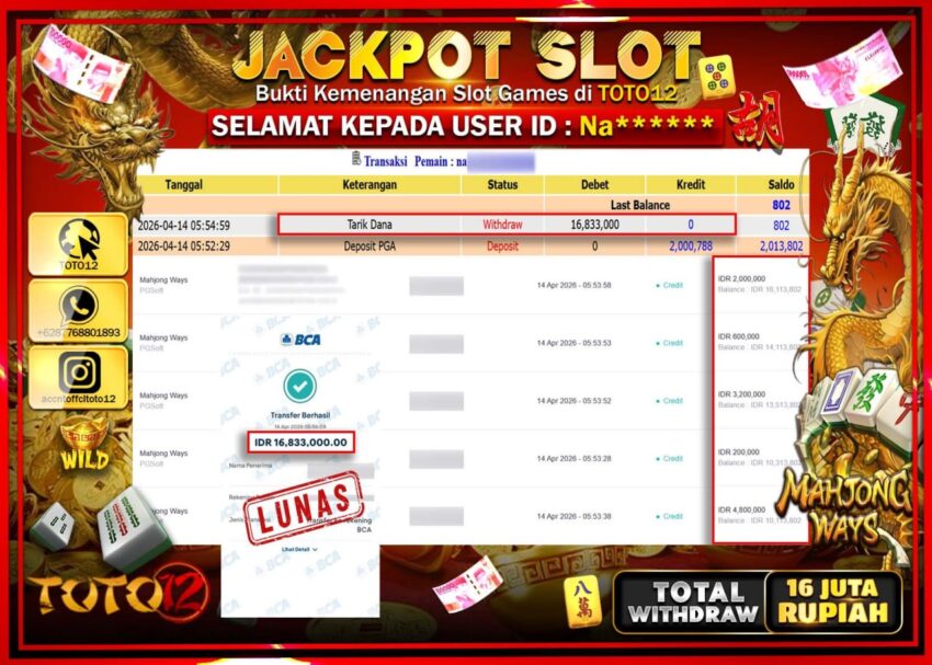 Selamat kepada Member Kami Na***** Telah Jackpot dan berhasil mendapatkan kemenangan besar pada permainan JACKPOT SLOT GAME  (MAHJONG WAYS)  Dengan Kemenangan Sebesar Rp.16.000.000–.