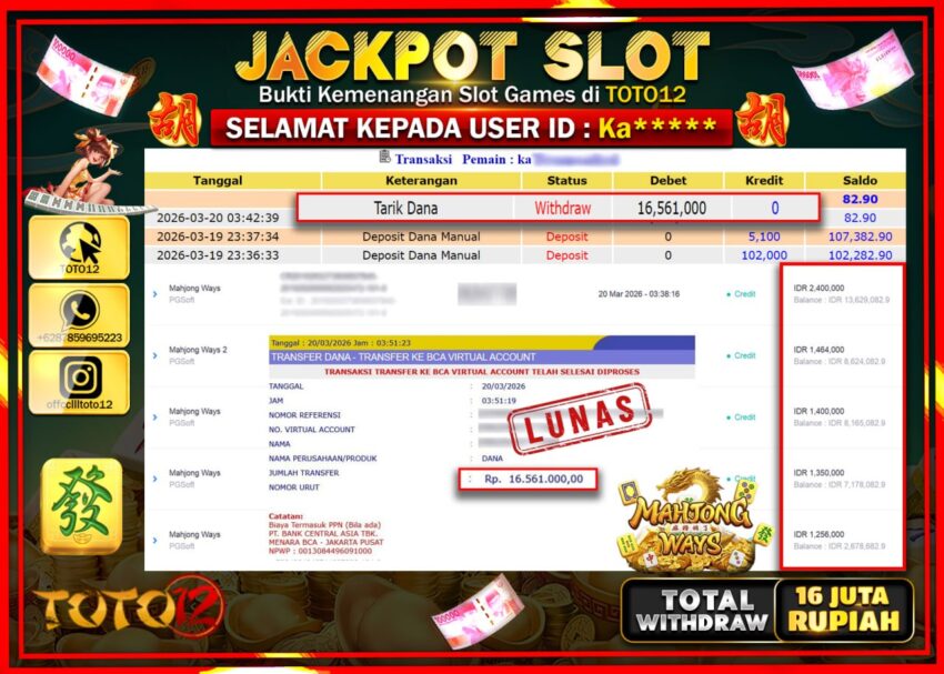 Selamat kepada Member Kami Ka**** Telah Jackpot dan berhasil mendapatkan kemenangan besar pada permainan JACKPOT SLOT GAME (MAHJONG WAYS) Dengan Kemenangan Sebesar Rp.16.561.000–.