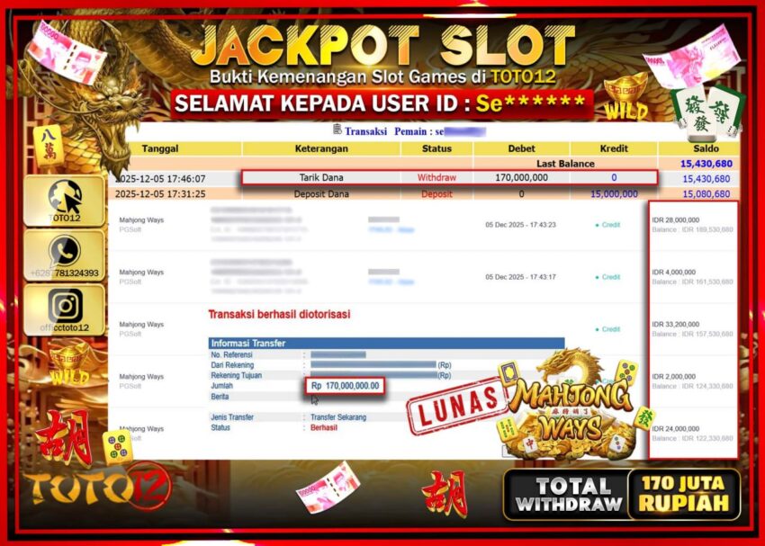 HANYA DI TOTO12 JP PASTI DI BAYAR LUNAS DAN CEPAT!!!!!! JACKPOT SLOT GAME (MAHJONG WAYS) Rp.170.000.000 !!!!