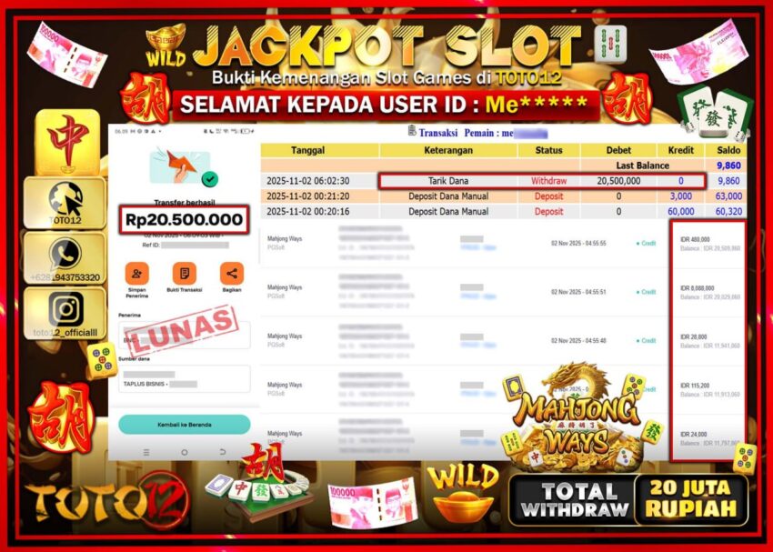 Selamat kepada Member Kami Me****** Telah Jackpot dan berhasil mendapatkan kemenangan besar pada permainan JACKPOT SLOT GAME (MAHJONG WAYS) Dengan Kemenangan Sebesar Rp.20.500.000 –. Setelah mengisi Fomulir Withdraw dengan Kurang waktu 1-2 Menit Dana sudah kami Trasnfer kepada Pemilik Userid dan dana sudah dapat di cairkan oleh pemenang. Bukti Pembayaran yang TOTO12 berikan merupakan Bukti Pembayaran yang SAH / VALID yang langsung Di dapatkan melalui transaksi dari Bank yang di Tunju.