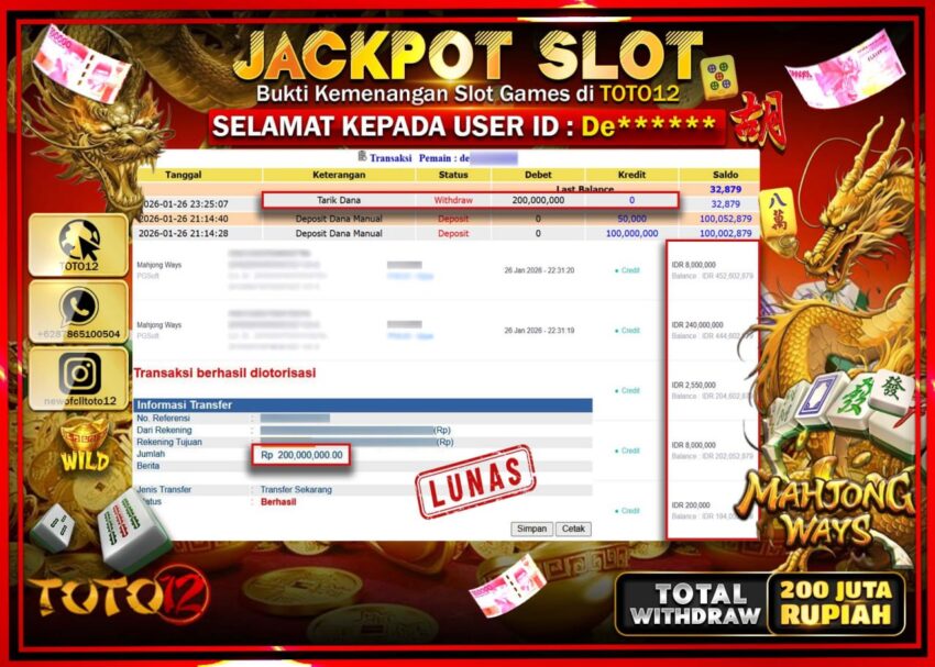 Selamat kepada Member Kami De****** Telah Jackpot dan berhasil mendapatkan kemenangan besar pada permainan JACKPOT SLOT GAME (MAHJONG WAYS) Dengan Kemenangan Sebesar Rp.200.000.000 –.