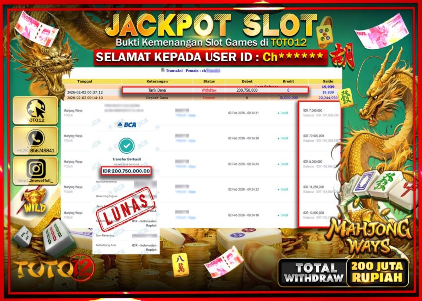 Selamat kepada Member Kami Ch****** Telah Jackpot dan berhasil mendapatkan kemenangan besar pada permainan JACKPOT SLOT GAME (MAHJONG WAYS)  Dengan Kemenangan Sebesar Rp.200.750.000 –.