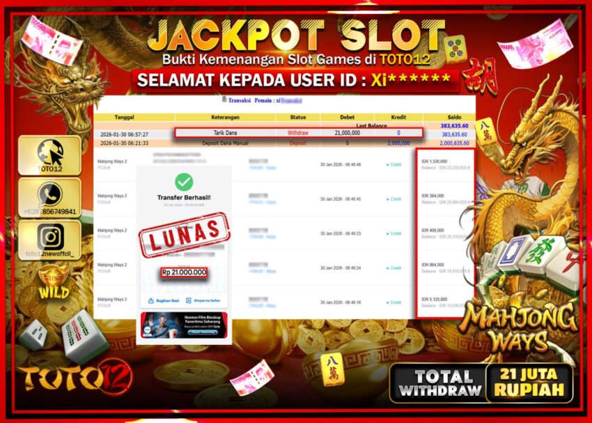 Selamat kepada Member Kami Xi****** Telah Jackpot dan berhasil mendapatkan kemenangan besar pada permainan JACKPOT SLOT GAME (MAHJONG WAYS) Dengan Kemenangan Sebesar Rp.21.000.000 –.