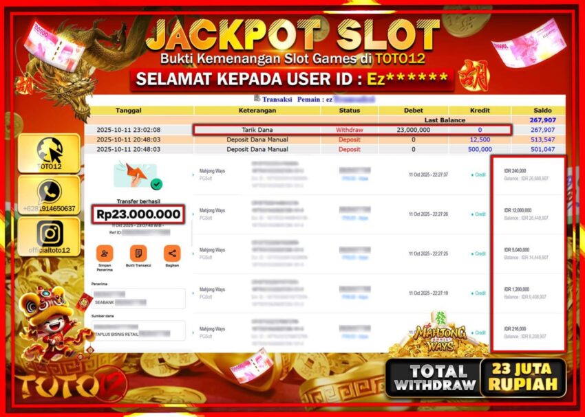 Selamat kepada Member Kami Ez****** Telah Jackpot dan berhasil mendapatkan kemenangan besar pada permainan JACKPOT SLOT GAME (MAHJONG WAYS) Dengan Kemenangan Sebesar Rp.23.000.000 –. Setelah mengisi Fomulir Withdraw dengan Kurang waktu 1-2 Menit Dana sudah kami Trasnfer kepada Pemilik Userid dan dana sudah dapat di cairkan oleh pemenang. Bukti Pembayaran yang TOTO12 berikan merupakan Bukti Pembayaran yang SAH / VALID yang langsung Di dapatkan melalui transaksi dari Bank yang di Tunju.