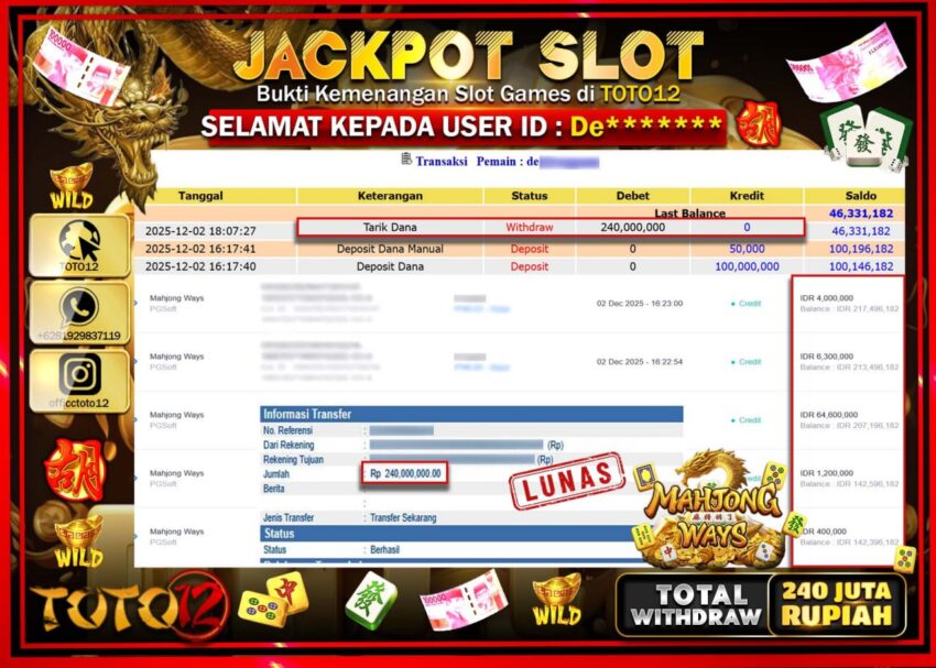 HANYA DI TOTO12 JP PASTI DI BAYAR LUNAS DAN CEPAT!!!!!! JACKPOT SLOT GAME (MAHJONG WAYS) Rp.240.000.000 !!!!