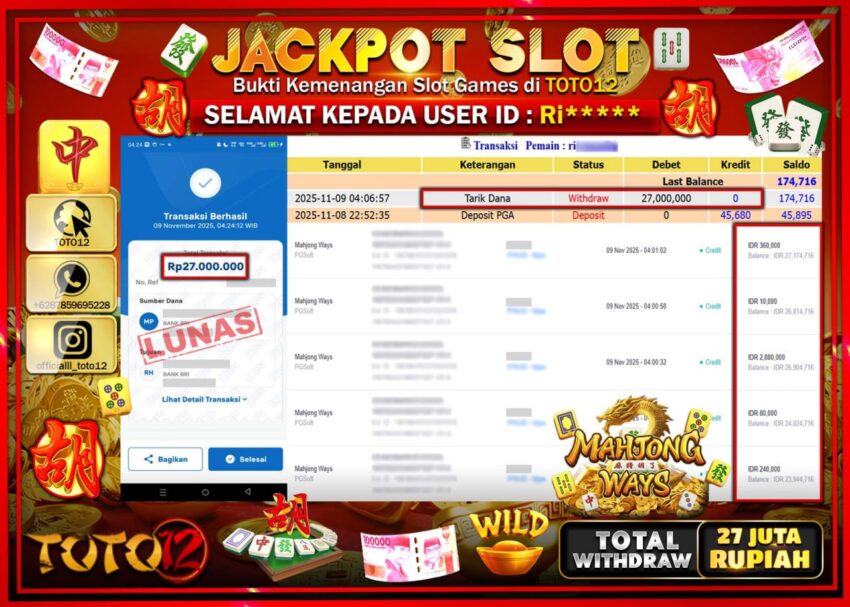 Selamat kepada Member Kami Ri****** Telah Jackpot dan berhasil mendapatkan kemenangan besar pada permainan JACKPOT SLOT GAME (MAHJONG WAYS) Dengan Kemenangan Sebesar Rp.27.000.000 –. Setelah mengisi Fomulir Withdraw dengan Kurang waktu 1-2 Menit Dana sudah kami Trasnfer kepada Pemilik Userid dan dana sudah dapat di cairkan oleh pemenang. Bukti Pembayaran yang TOTO12 berikan merupakan Bukti Pembayaran yang SAH / VALID yang langsung Di dapatkan melalui transaksi dari Bank yang di Tunju.
