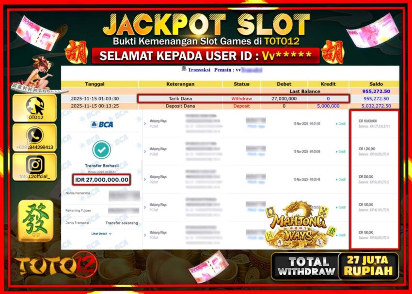 Selamat kepada Member Kami Vv****** Telah Jackpot dan berhasil mendapatkan kemenangan besar pada permainan JACKPOT SLOT GAME (MAHJONG WAYS) Dengan Kemenangan Sebesar Rp.27.000.000 –. Setelah mengisi Fomulir Withdraw dengan Kurang waktu 1-2 Menit Dana sudah kami Trasnfer kepada Pemilik Userid dan dana sudah dapat di cairkan oleh pemenang. Bukti Pembayaran yang TOTO12 berikan merupakan Bukti Pembayaran yang SAH / VALID yang langsung Di dapatkan melalui transaksi dari Bank yang di Tunju.