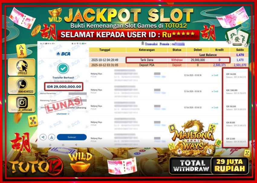 Selamat kepada Member Kami Ru****** Telah Jackpot dan berhasil mendapatkan kemenangan besar pada permainan JACKPOT SLOT GAME (MAHJONG WAYS)  Dengan Kemenangan Sebesar Rp.29.000.000 –.  Setelah mengisi Fomulir Withdraw dengan Kurang waktu 1-2 Menit Dana sudah kami Trasnfer kepada Pemilik Userid dan dana sudah dapat di cairkan oleh pemenang. Bukti Pembayaran yang TOTO12 berikan merupakan Bukti Pembayaran yang  SAH / VALID yang langsung Di dapatkan melalui transaksi dari Bank yang di Tunju.