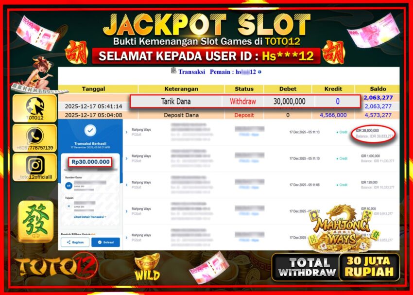 Selamat kepada Member Kami Hs****** Telah Jackpot dan berhasil mendapatkan kemenangan besar pada permainan JACKPOT SLOT GAME (MAHJONG WAYS)  Dengan Kemenangan Sebesar Rp.30.000.000 –.