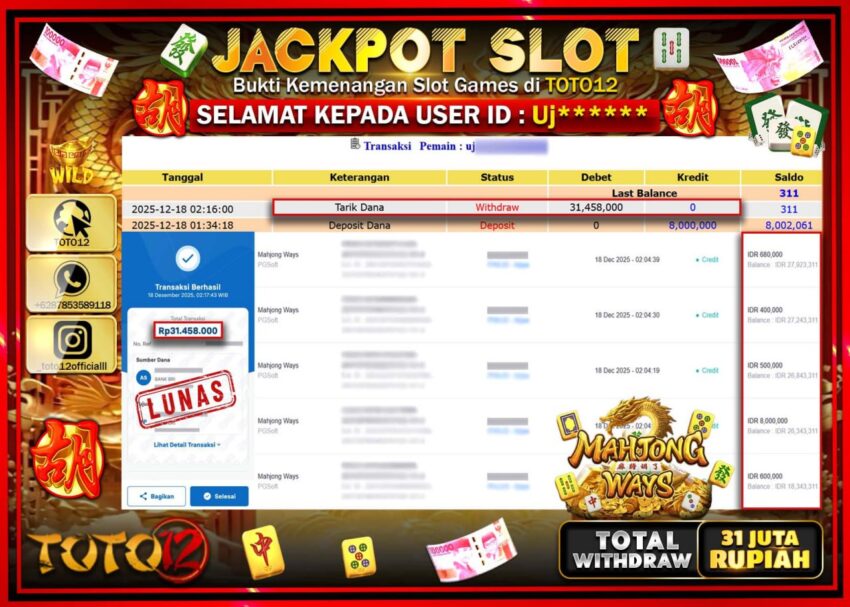 Selamat kepada Member Kami Uj****** Telah Jackpot dan berhasil mendapatkan kemenangan besar pada permainan JACKPOT SLOT GAME (MAHJONG WAYS) Dengan Kemenangan Sebesar Rp.31.458.000 –.