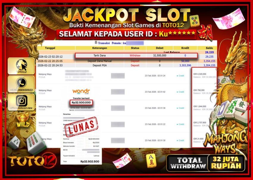 HANYA DI TOTO12 JP PASTI DI BAYAR LUNAS DAN CEPAT!!!!!! JACKPOT SLOT GAME (MAHJONG WAYS) Rp.32.500.000!!!!