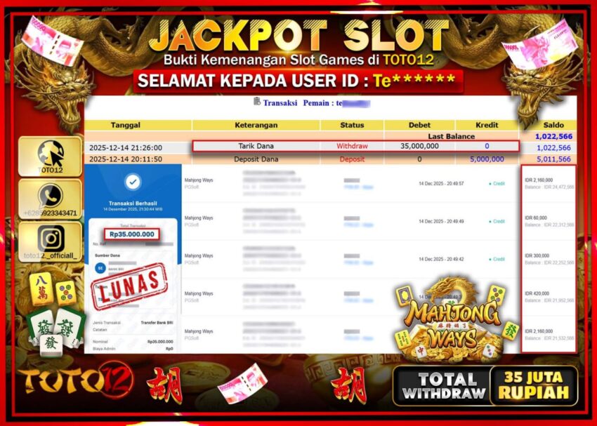 HANYA DI TOTO12 JP PASTI DI BAYAR LUNAS DAN CEPAT!!!!!! JACKPOT SLOT GAME (MAHJONG WAYS) Rp.35.000.000 !!!!