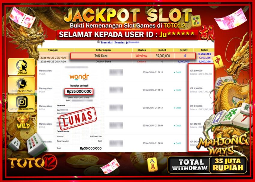 Selamat kepada Member Kami Ju**** Telah Jackpot dan berhasil mendapatkan kemenangan besar pada permainan JACKPOT SLOT GAME  (MAHJONG WAYS)  Dengan Kemenangan Sebesar Rp.35.000.000–.