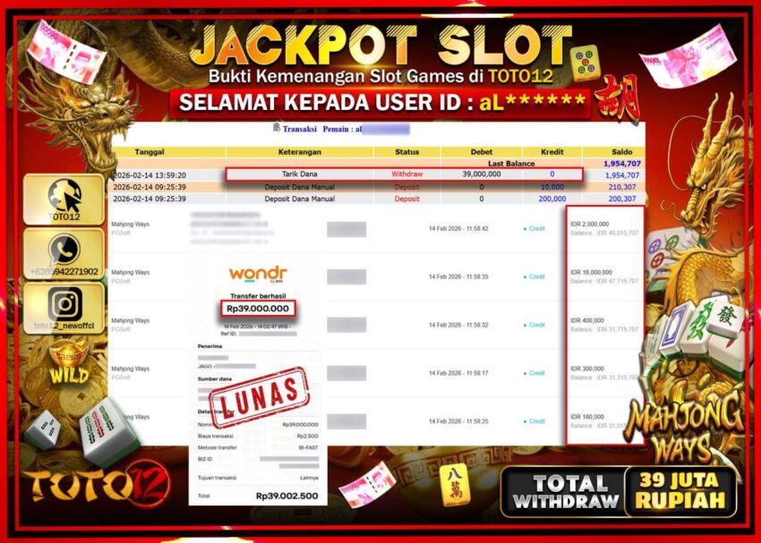 Selamat kepada Member Kami aL****** Telah Jackpot dan berhasil mendapatkan kemenangan besar pada permainan JACKPOT SLOT GAME (MAHJONG WAYS) Dengan Kemenangan Sebesar Rp.39.000.000–.