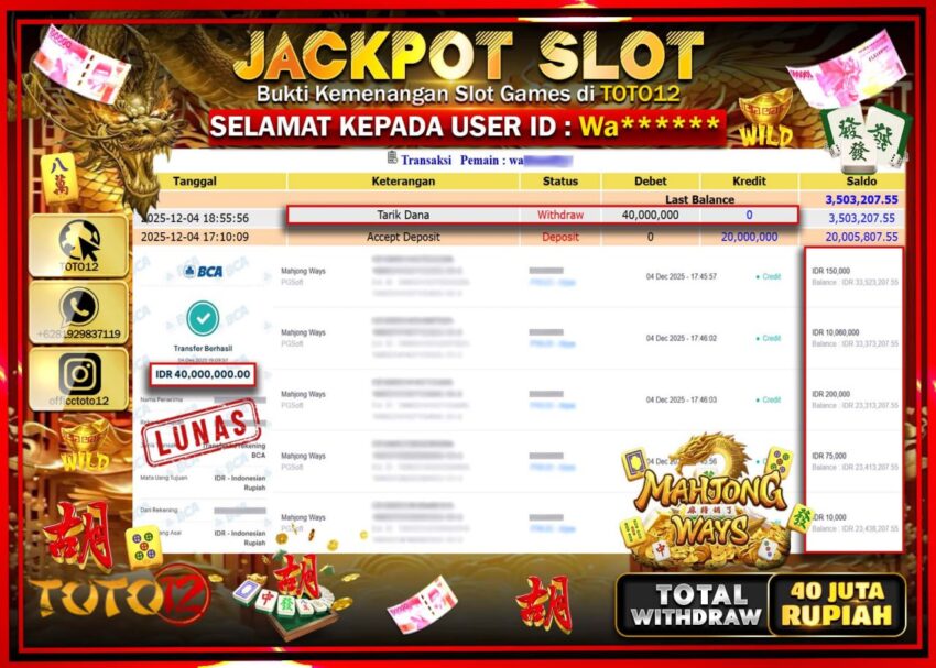 Selamat kepada Member Kami Wa****** Telah Jackpot dan berhasil mendapatkan kemenangan besar pada permainan JACKPOT SLOT GAME (MAHJONG WAYS) Dengan Kemenangan Sebesar Rp.40.000.000 –.