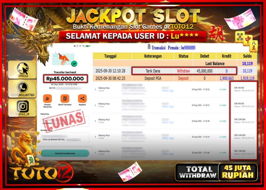 Selamat kepada Member Kami Lu****** Telah Jackpot dan berhasil mendapatkan kemenangan besar pada permainan JACKPOT SLOT GAME (MAHJONG WAYS) Dengan Kemenangan Sebesar Rp.45.000.000 –. Setelah mengisi Fomulir Withdraw dengan Kurang waktu 1-2 Menit Dana sudah kami Trasnfer kepada Pemilik Userid dan dana sudah dapat di cairkan oleh pemenang. Bukti Pembayaran yang TOTO12 berikan merupakan Bukti Pembayaran yang SAH / VALID yang langsung Di dapatkan melalui transaksi dari Bank yang di Tunju.