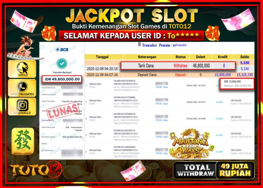 Selamat kepada Member Kami To****** Telah Jackpot dan berhasil mendapatkan kemenangan besar pada permainan JACKPOT SLOT GAME (MAHJONG WAYS) Dengan Kemenangan Sebesar Rp.49.800.000 –.