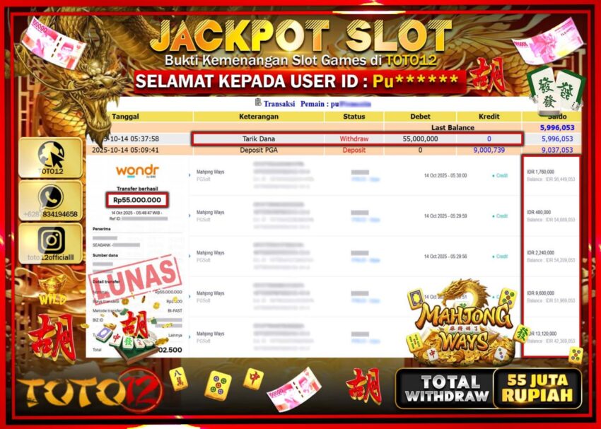 Selamat kepada Member Kami Pu****** Telah Jackpot dan berhasil mendapatkan kemenangan besar pada permainan JACKPOT SLOT GAME (MAHJONG WAYS)  Dengan Kemenangan Sebesar Rp.55.000.000 –.  Setelah mengisi Fomulir Withdraw dengan Kurang waktu 1-2 Menit Dana sudah kami Trasnfer kepada Pemilik Userid dan dana sudah dapat di cairkan oleh pemenang. Bukti Pembayaran yang TOTO12 berikan merupakan Bukti Pembayaran yang  SAH / VALID yang langsung Di dapatkan melalui transaksi dari Bank yang di Tunju.