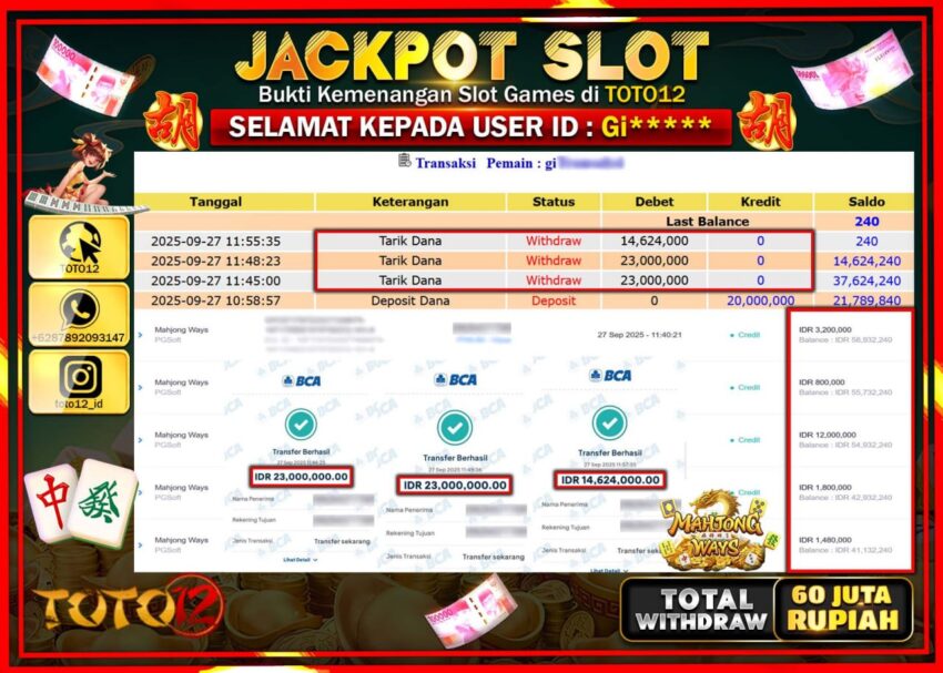 Selamat kepada Member Kami Gi****** Telah Jackpot dan berhasil mendapatkan kemenangan besar pada permainan JACKPOT SLOT GAME (MAHJONG WAYS) Dengan Kemenangan Sebesar Rp.60.624.000 –. Setelah mengisi Fomulir Withdraw dengan Kurang waktu 1-2 Menit Dana sudah kami Trasnfer kepada Pemilik Userid dan dana sudah dapat di cairkan oleh pemenang. Bukti Pembayaran yang TOTO12 berikan merupakan Bukti Pembayaran yang SAH / VALID yang langsung Di dapatkan melalui transaksi dari Bank yang di Tunju.