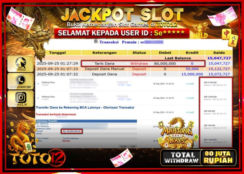 Selamat kepada Member Kami Se****** Telah Jackpot dan berhasil mendapatkan kemenangan besar pada permainan JACKPOT SLOT GAME (MAHJONG WAYS) Dengan Kemenangan Sebesar Rp.80.000.000 –. Setelah mengisi Fomulir Withdraw dengan Kurang waktu 1-2 Menit Dana sudah kami Trasnfer kepada Pemilik Userid dan dana sudah dapat di cairkan oleh pemenang. Bukti Pembayaran yang TOTO12 berikan merupakan Bukti Pembayaran yang SAH / VALID yang langsung Di dapatkan melalui transaksi dari Bank yang di Tunju.