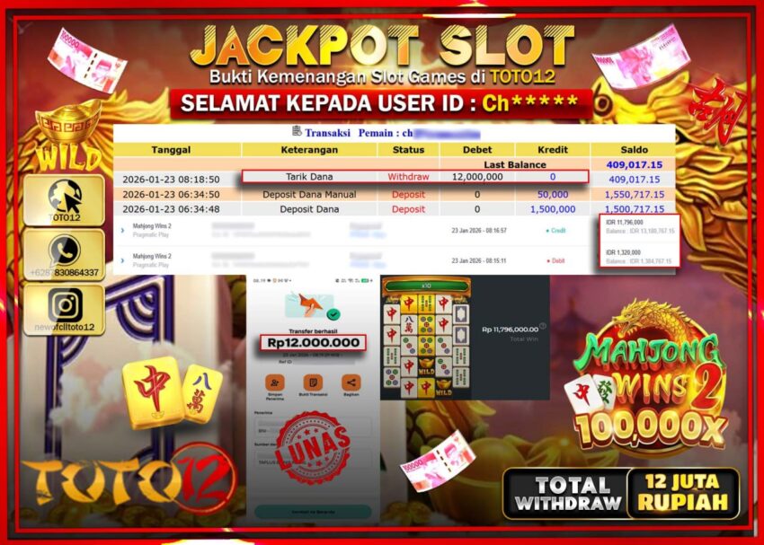 Selamat kepada Member Kami Ch****** Telah Jackpot dan berhasil mendapatkan kemenangan besar pada permainan JACKPOT SLOT GAME (MAHJONG WINS 2) Dengan Kemenangan Sebesar Rp.12.000.000 –.
