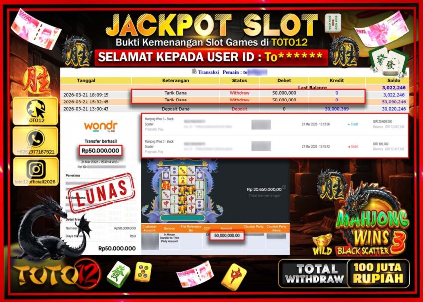Selamat kepada Member Kami To**** Telah Jackpot dan berhasil mendapatkan kemenangan besar pada permainan JACKPOT SLOT GAME (MAHJONG WINS 3 BLACK SCATTER) Dengan Kemenangan Sebesar Rp.100.000.000–.
