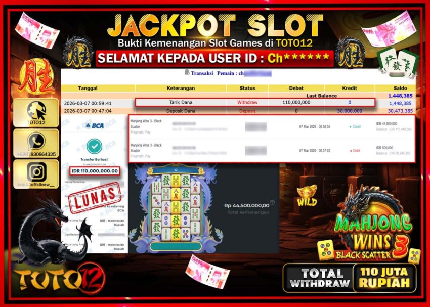 Selamat kepada Member Kami Ch**** Telah Jackpot dan berhasil mendapatkan kemenangan besar pada permainan JACKPOT SLOT GAME (MAHJONG WINS 3 BLACK SCATTER) Dengan Kemenangan Sebesar Rp.110.000.000–.