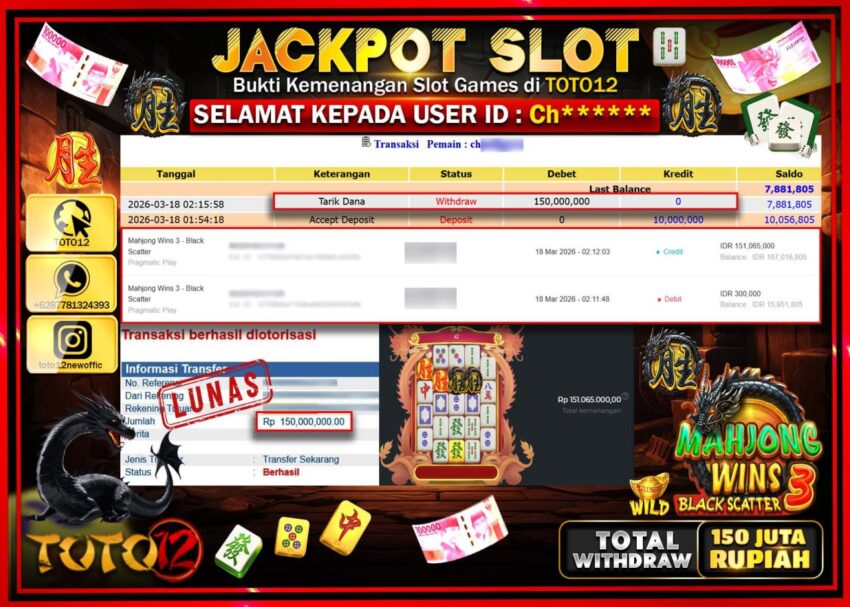 Selamat kepada Member Kami Ch****** Telah Jackpot dan berhasil mendapatkan kemenangan besar pada permainan JACKPOT SLOT GAME (MAHJONG WINS 3 BLACK SCATTER) Dengan Kemenangan Sebesar Rp.150.000.000.