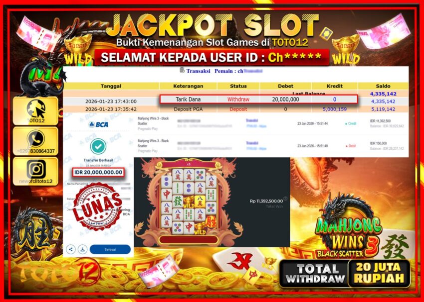Selamat kepada Member Kami Ch****** Telah Jackpot dan berhasil mendapatkan kemenangan besar pada permainan JACKPOT SLOT GAME (MAHJONG WINS 3 BLACK SCATTER) Dengan Kemenangan Sebesar Rp.20.000.000 –.