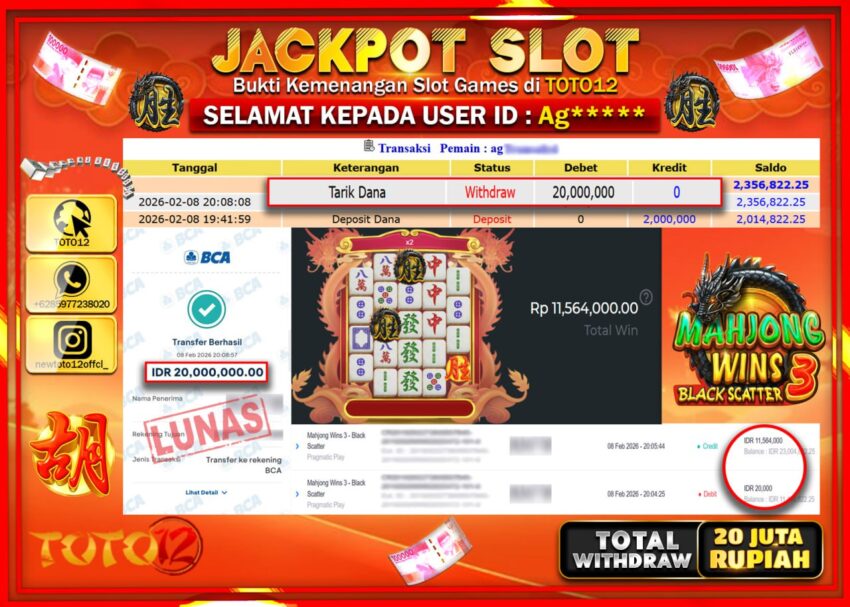Selamat kepada Member Kami Ag**** Telah Jackpot dan berhasil mendapatkan kemenangan besar pada permainan JACKPOT SLOT GAME         (MAHJONG WINS 3 – BLACK SCATTER)  Dengan Kemenangan Sebesar Rp.20.000.000–.