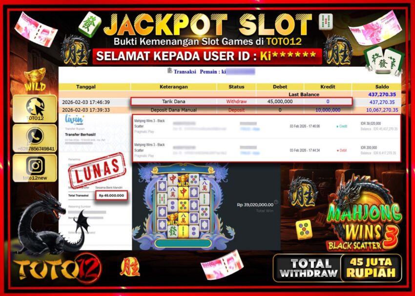 Selamat kepada Member Kami Ki****** Telah Jackpot dan berhasil mendapatkan kemenangan besar pada permainan JACKPOT SLOT GAME (MAHJONG WINS 3 BLACK SCATTER) Dengan Kemenangan Sebesar Rp.45.000.000 –.
