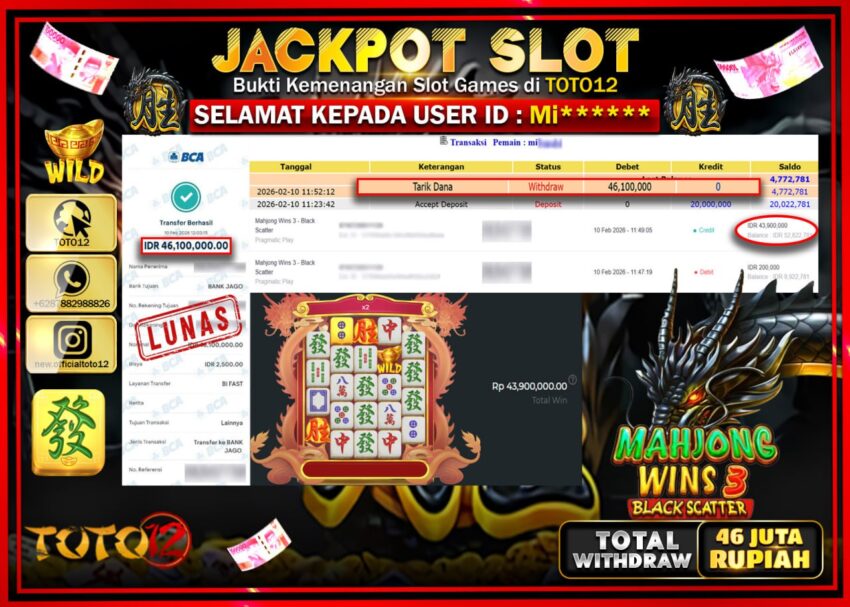 Selamat kepada Member Kami Mi***** Telah Jackpot dan berhasil mendapatkan kemenangan besar pada permainan JACKPOT SLOT GAME (MAHJONG WINS 3 BLACK SCATTER) Dengan Kemenangan Sebesar Rp.46.100.000–.
