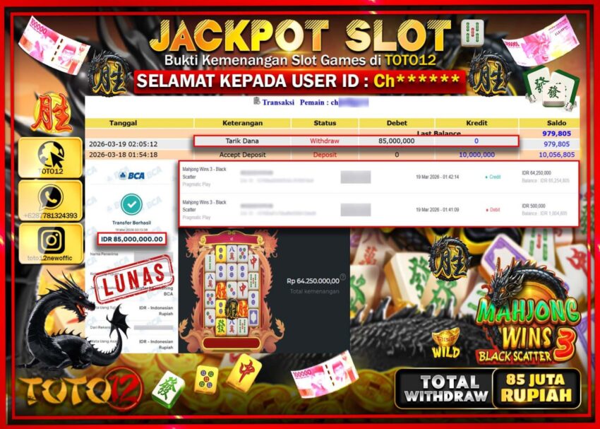 Selamat kepada Member Kami Ch****** Telah Jackpot dan berhasil mendapatkan kemenangan besar pada permainan JACKPOT SLOT GAME  (MAHJONG WINS 3 BLACK SCATTER)  Dengan Kemenangan Sebesar Rp.85.000.000.