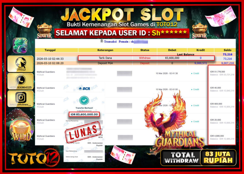 Selamat kepada Member Kami Sh**** Telah Jackpot dan berhasil mendapatkan kemenangan besar pada permainan JACKPOT SLOT GAME (MYTHICAL GUARDIANS) Dengan Kemenangan Sebesar Rp.83.600.000–.