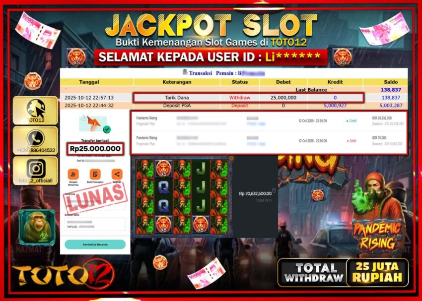 Selamat kepada Member Kami Li****** Telah Jackpot dan berhasil mendapatkan kemenangan besar pada permainan JACKPOT SLOT GAME (PANDEMIC RISING) Dengan Kemenangan Sebesar Rp.25.000.000 –. Setelah mengisi Fomulir Withdraw dengan Kurang waktu 1-2 Menit Dana sudah kami Trasnfer kepada Pemilik Userid dan dana sudah dapat di cairkan oleh pemenang. Bukti Pembayaran yang TOTO12 berikan merupakan Bukti Pembayaran yang SAH / VALID yang langsung Di dapatkan melalui transaksi dari Bank yang di Tunju.