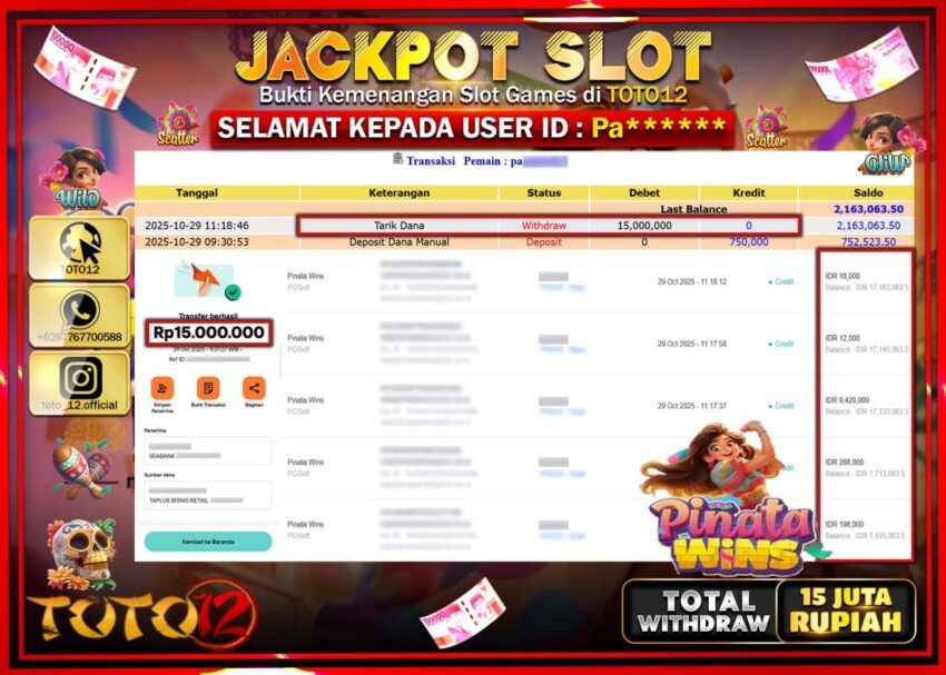 Selamat kepada Member Kami Pa****** Telah Jackpot dan berhasil mendapatkan kemenangan besar pada permainan JACKPOT SLOT GAME (PINATA WINS) Dengan Kemenangan Sebesar Rp.15.000.000 –. Setelah mengisi Fomulir Withdraw dengan Kurang waktu 1-2 Menit Dana sudah kami Trasnfer kepada Pemilik Userid dan dana sudah dapat di cairkan oleh pemenang. Bukti Pembayaran yang TOTO12 berikan merupakan Bukti Pembayaran yang SAH / VALID yang langsung Di dapatkan melalui transaksi dari Bank yang di Tunju.