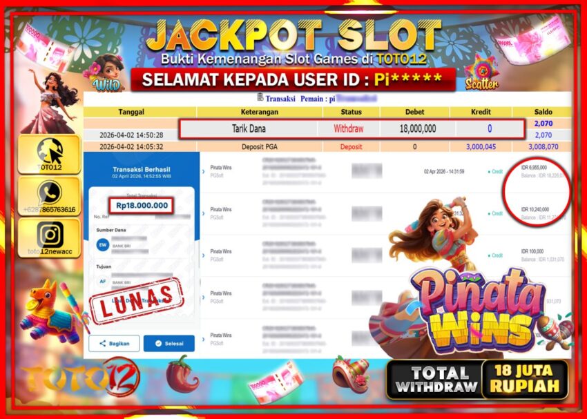 Selamat kepada Member Kami Pi***** Telah Jackpot dan berhasil mendapatkan kemenangan besar pada permainan JACKPOT SLOT GAME (PINATA WINS) Dengan Kemenangan Sebesar Rp.18.000.000–.