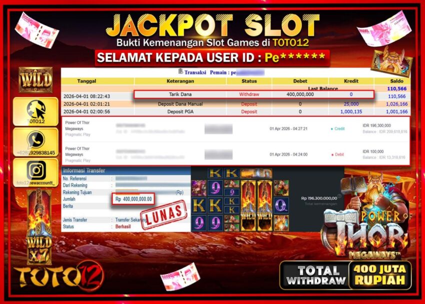 HANYA DI TOTO12 JP PASTI DI BAYAR LUNAS DAN CEPAT!!!!!! JACKPOT SLOT GAME (POWER OF THOR MEGAWAYS) Rp.400.000.000!!!!