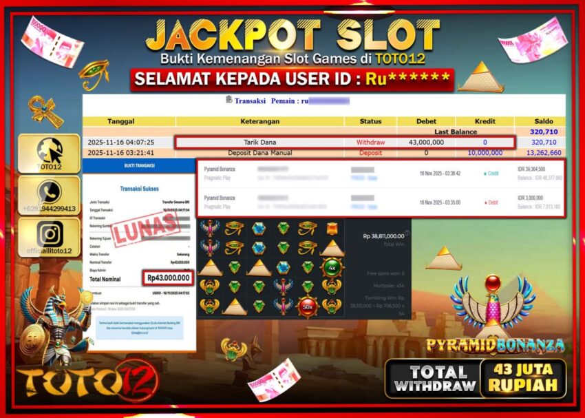 Selamat kepada Member Kami Ru****** Telah Jackpot dan berhasil mendapatkan kemenangan besar pada permainan JACKPOT SLOT GAME (PYRAMID BONANZA) Dengan Kemenangan Sebesar Rp.43.000.000 –. Setelah mengisi Fomulir Withdraw dengan Kurang waktu 1-2 Menit Dana sudah kami Trasnfer kepada Pemilik Userid dan dana sudah dapat di cairkan oleh pemenang. Bukti Pembayaran yang TOTO12 berikan merupakan Bukti Pembayaran yang SAH / VALID yang langsung Di dapatkan melalui transaksi dari Bank yang di Tunju.