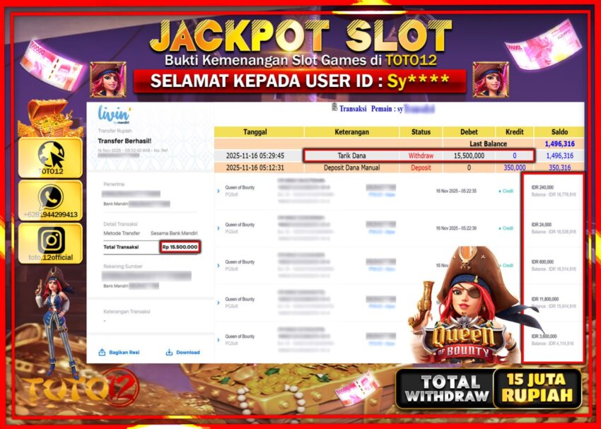 Selamat kepada Member Kami Sy****** Telah Jackpot dan berhasil mendapatkan kemenangan besar pada permainan JACKPOT SLOT GAME (QUEEN OF BOUNTY) Dengan Kemenangan Sebesar Rp.15.500.000 –. Setelah mengisi Fomulir Withdraw dengan Kurang waktu 1-2 Menit Dana sudah kami Trasnfer kepada Pemilik Userid dan dana sudah dapat di cairkan oleh pemenang. Bukti Pembayaran yang TOTO12 berikan merupakan Bukti Pembayaran yang SAH / VALID yang langsung Di dapatkan melalui transaksi dari Bank yang di Tunju.