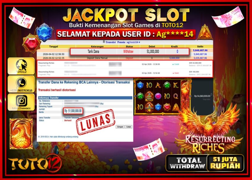Selamat kepada Member Kami Ag*****14 Telah Jackpot dan berhasil mendapatkan kemenangan besar pada permainan JACKPOT SLOT GAME (RESURRECTING RICHES) Dengan Kemenangan Sebesar Rp.51.000.000–.